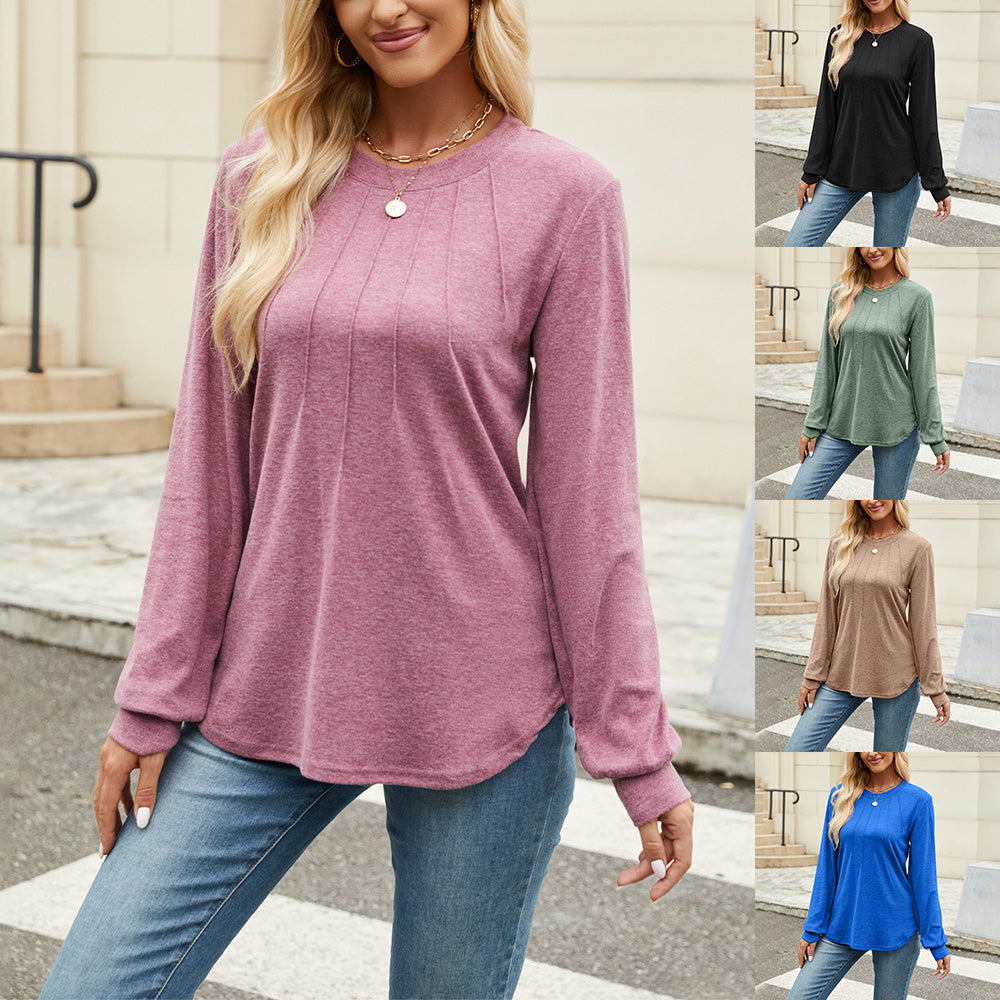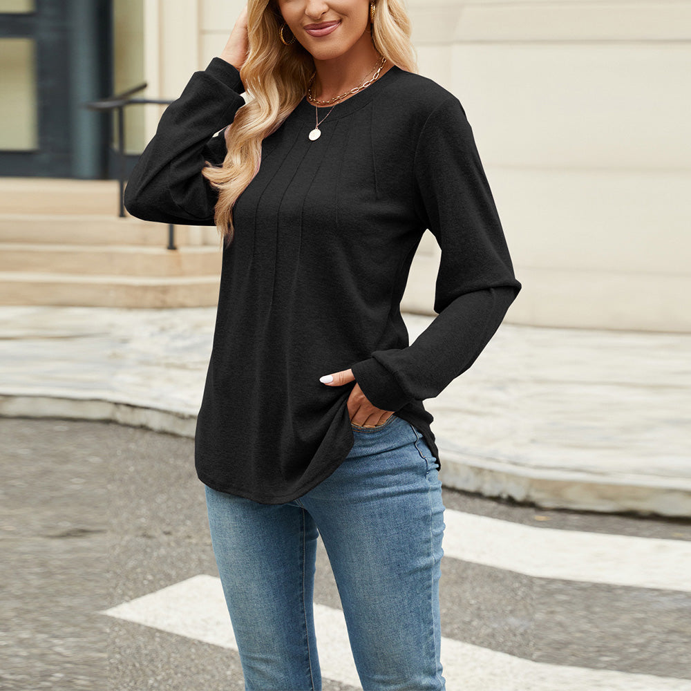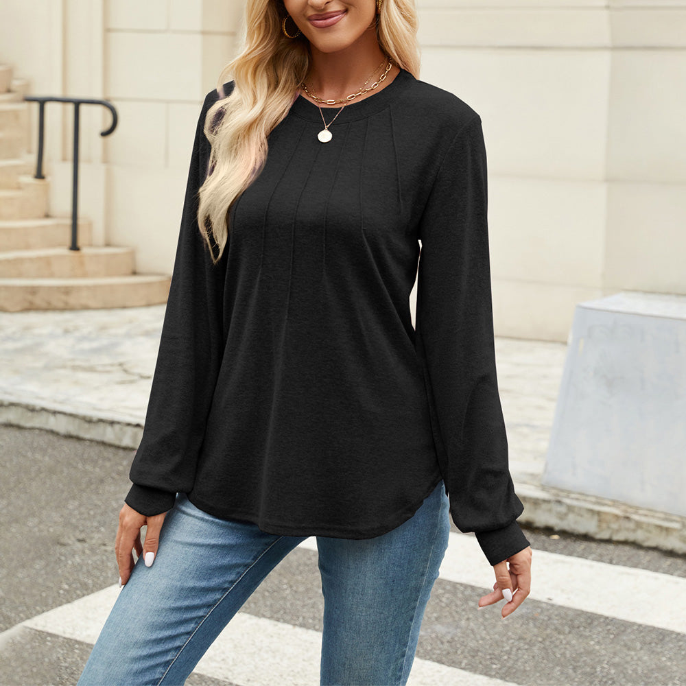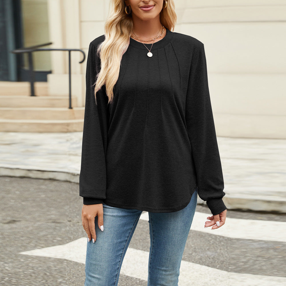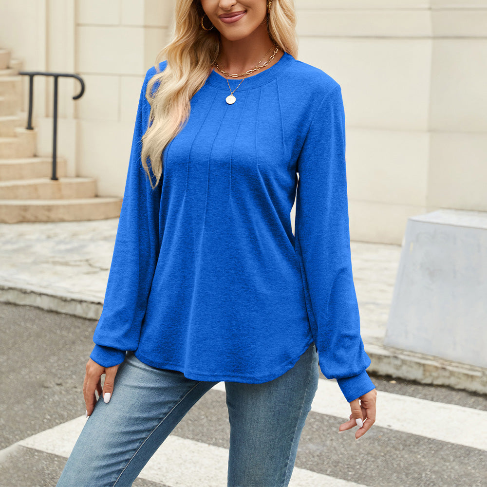 Neue Damenmode Lässig Plissiert Rundhals Langarm Top