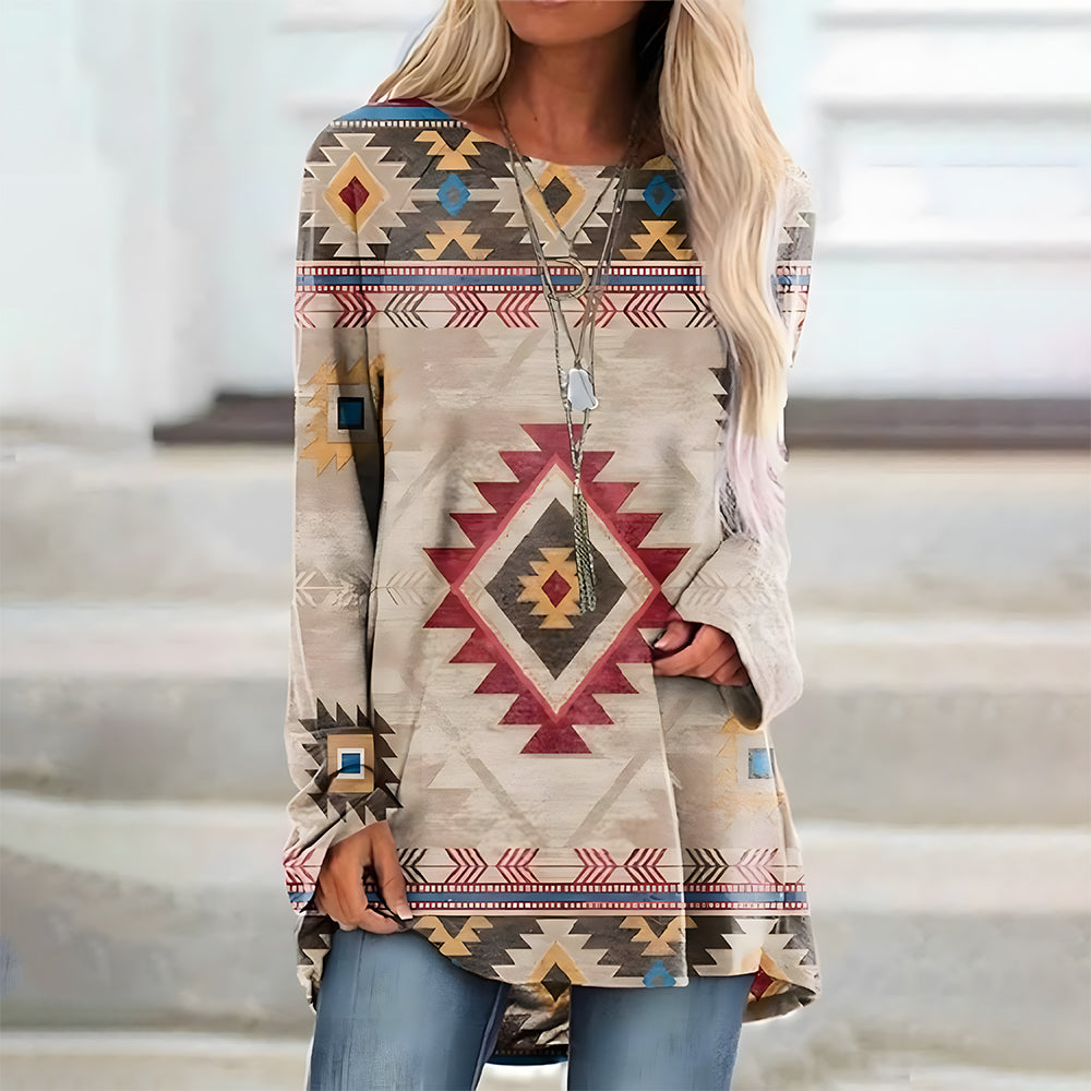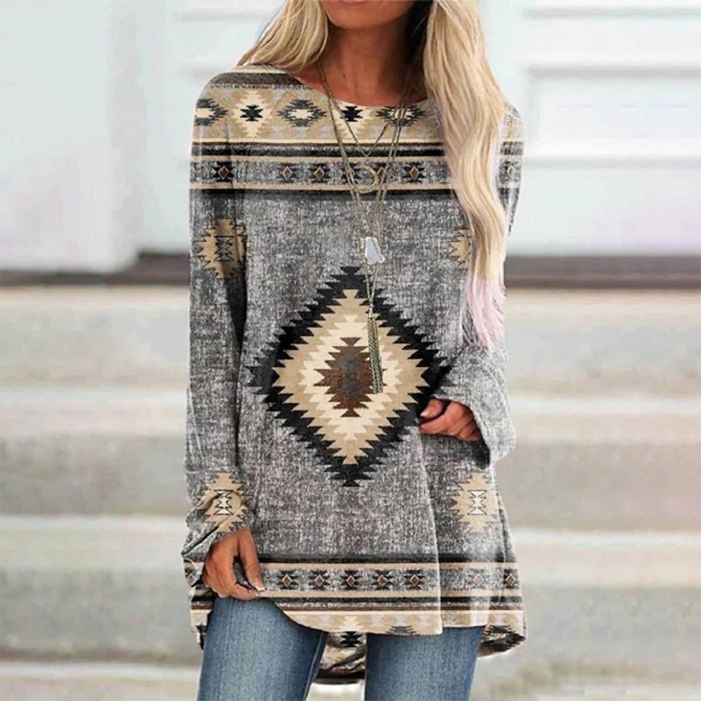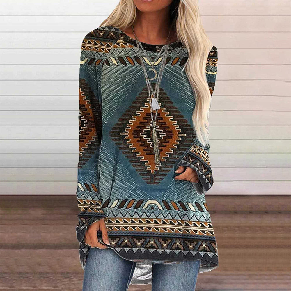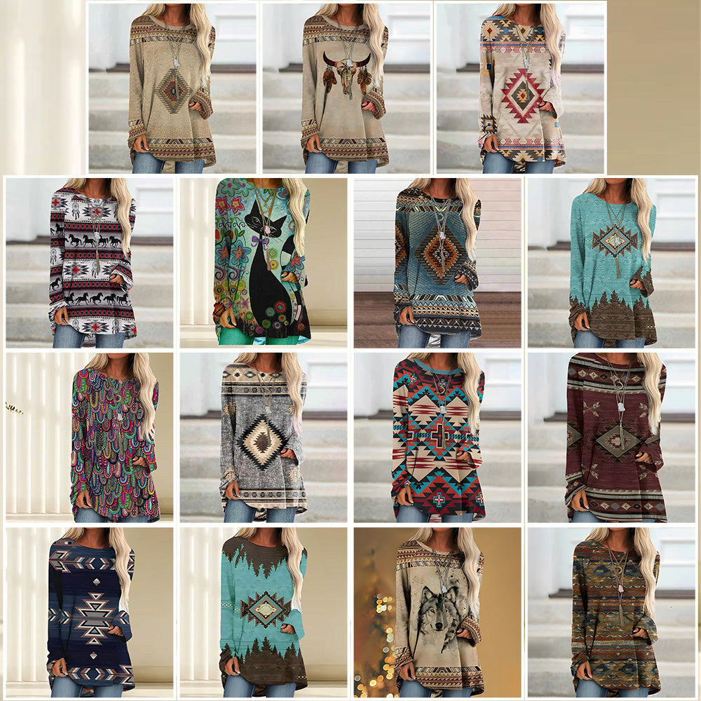Trendiges Langes T-Shirt Im Retro-Bohemian-Stil, Bedruckt Für Damen