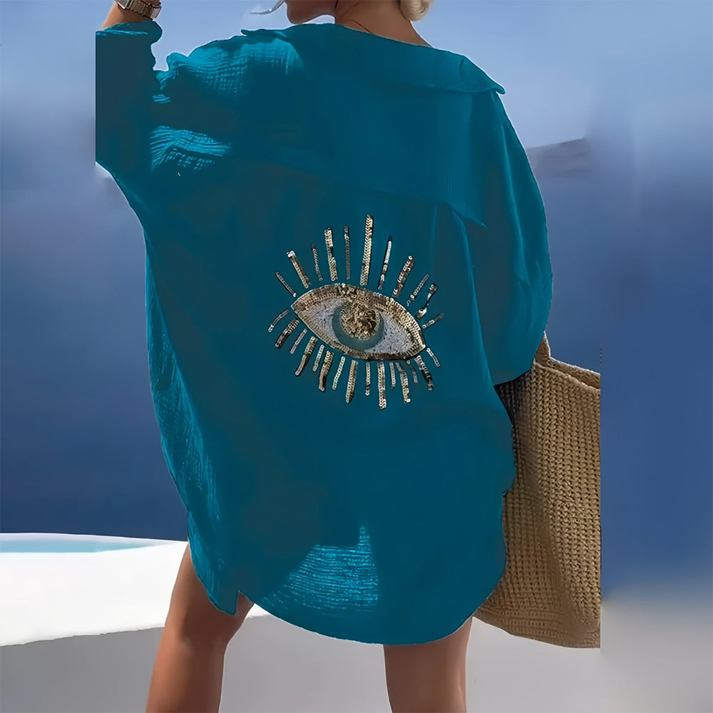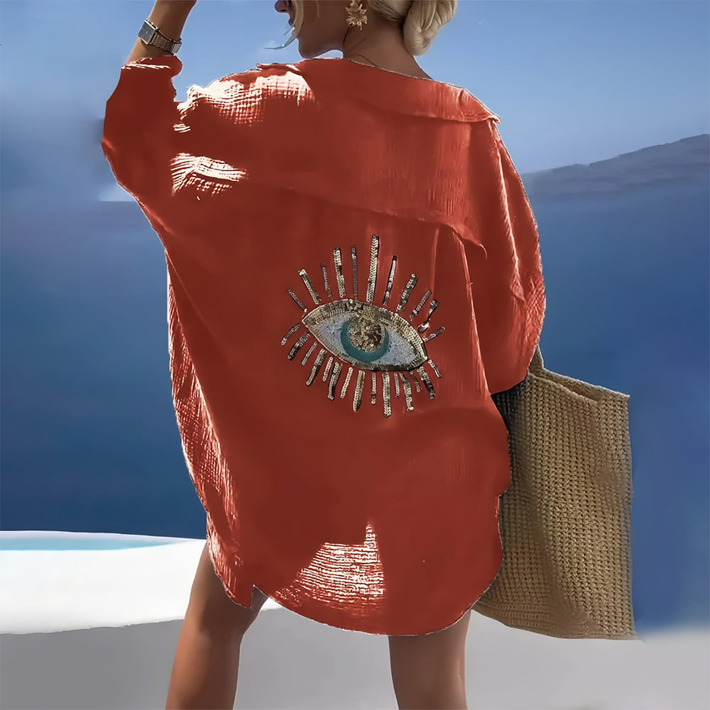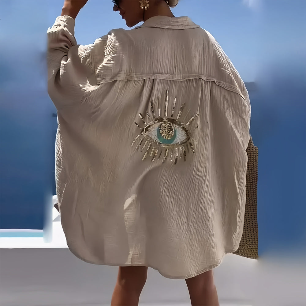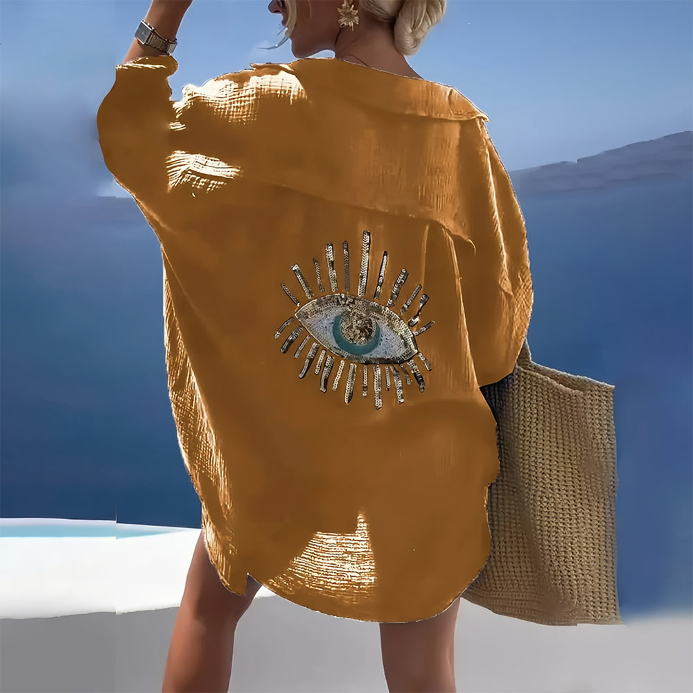 Damen-Hemdjacke aus Baumwolle und Leinen mit Paillettenaugen-Print