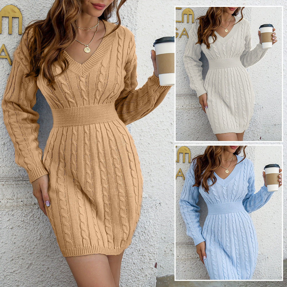 Eng Anliegendes Herbst-Strickkleid Mit V-Ausschnitt Und Hüftbetonter Taille Für Damen