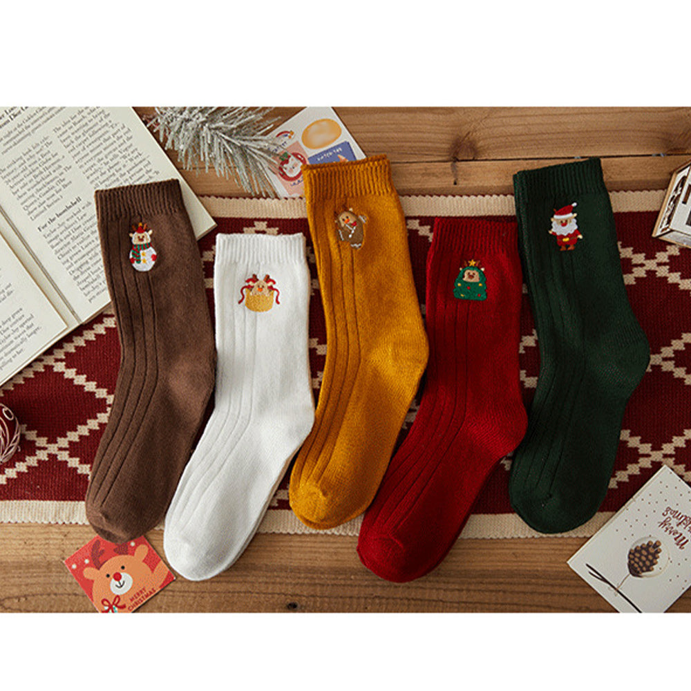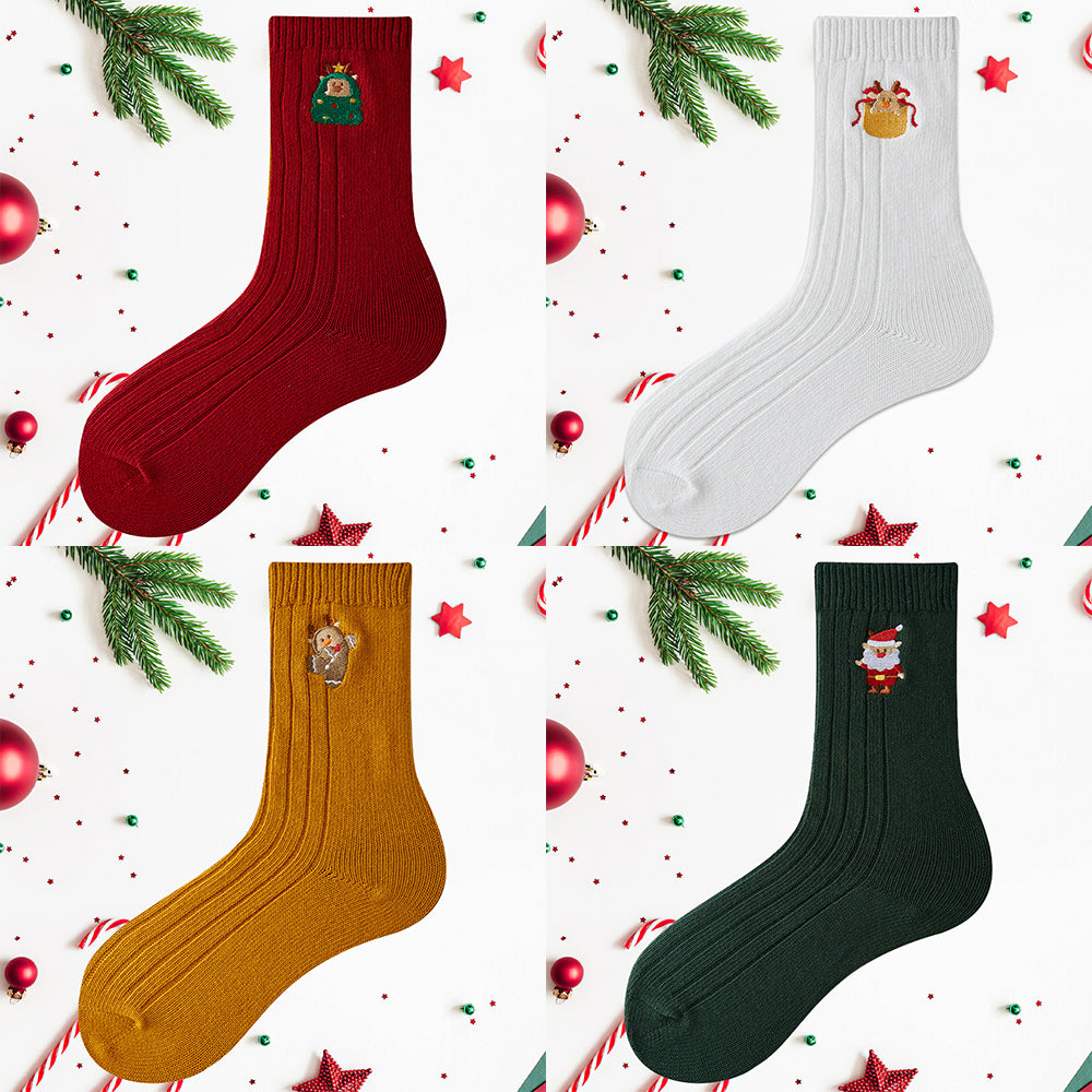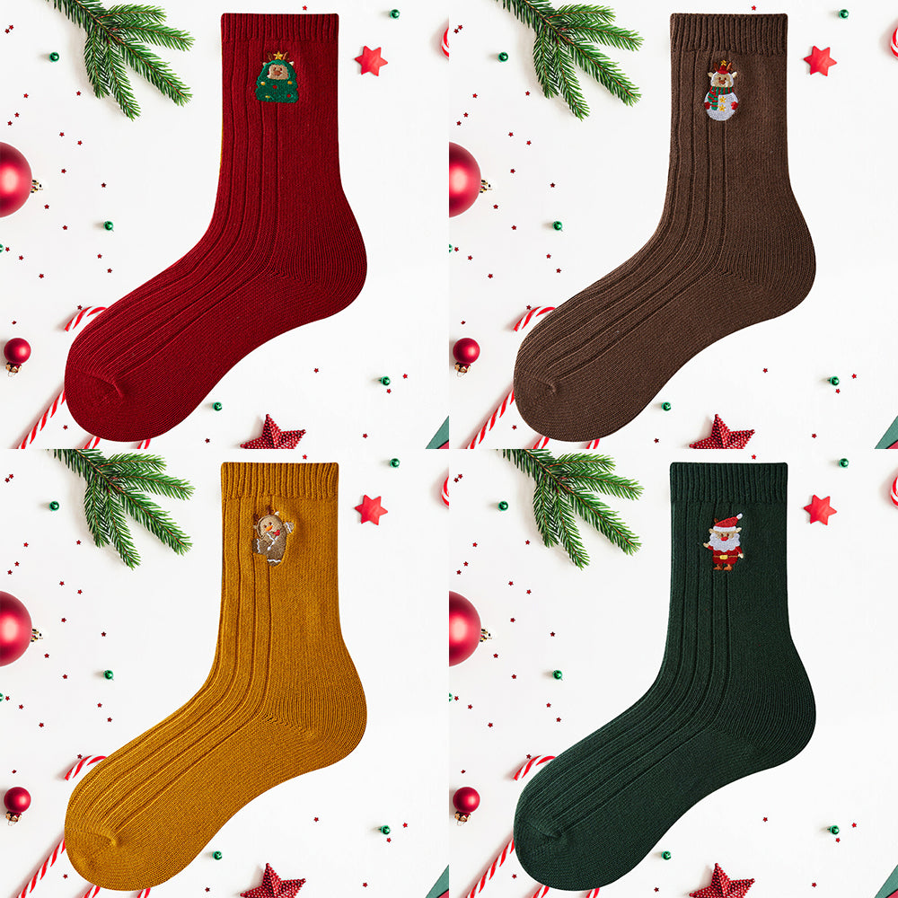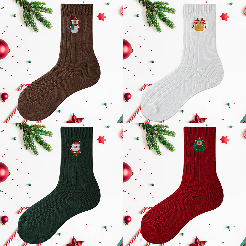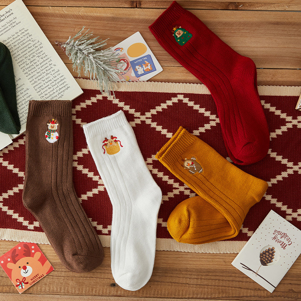 • 1/4 x Damen-Winter-Cartoon-Stickerei-Doppelnadel-Weihnachtssocken in Der Wadenmitte