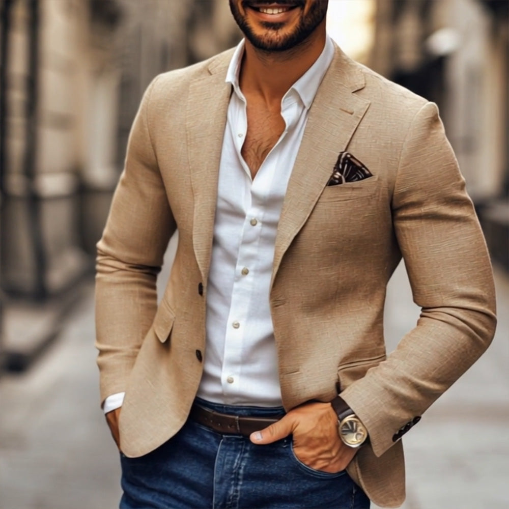 - Stil: Dank der gelungenen Mischung aus Komfort und Eleganz ist dieses Sakko vielseitig einsetzbar – vom entspannten Kaffeetreffen bis hin zu smart-casual Events.
