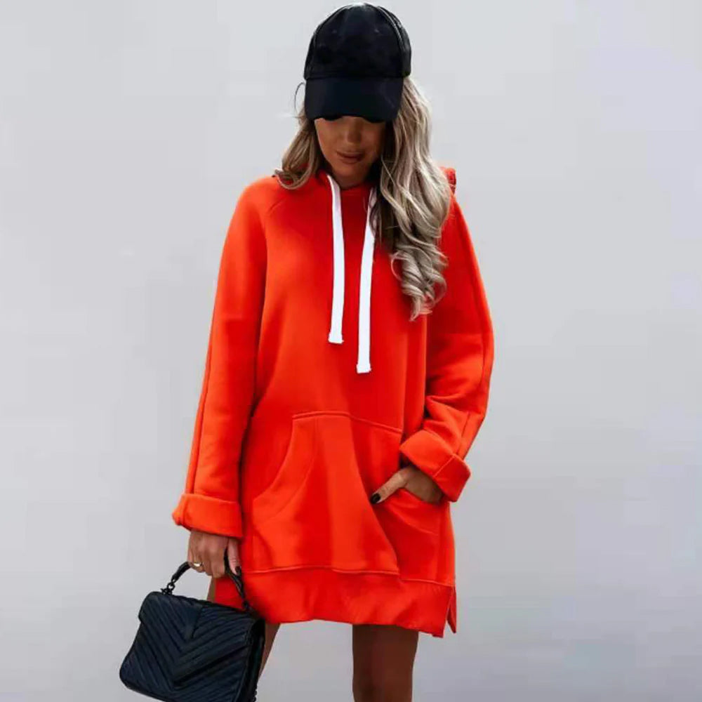 Neues Einfarbiges Mittellanges Damen-Sweatshirt Mit Kapuze
