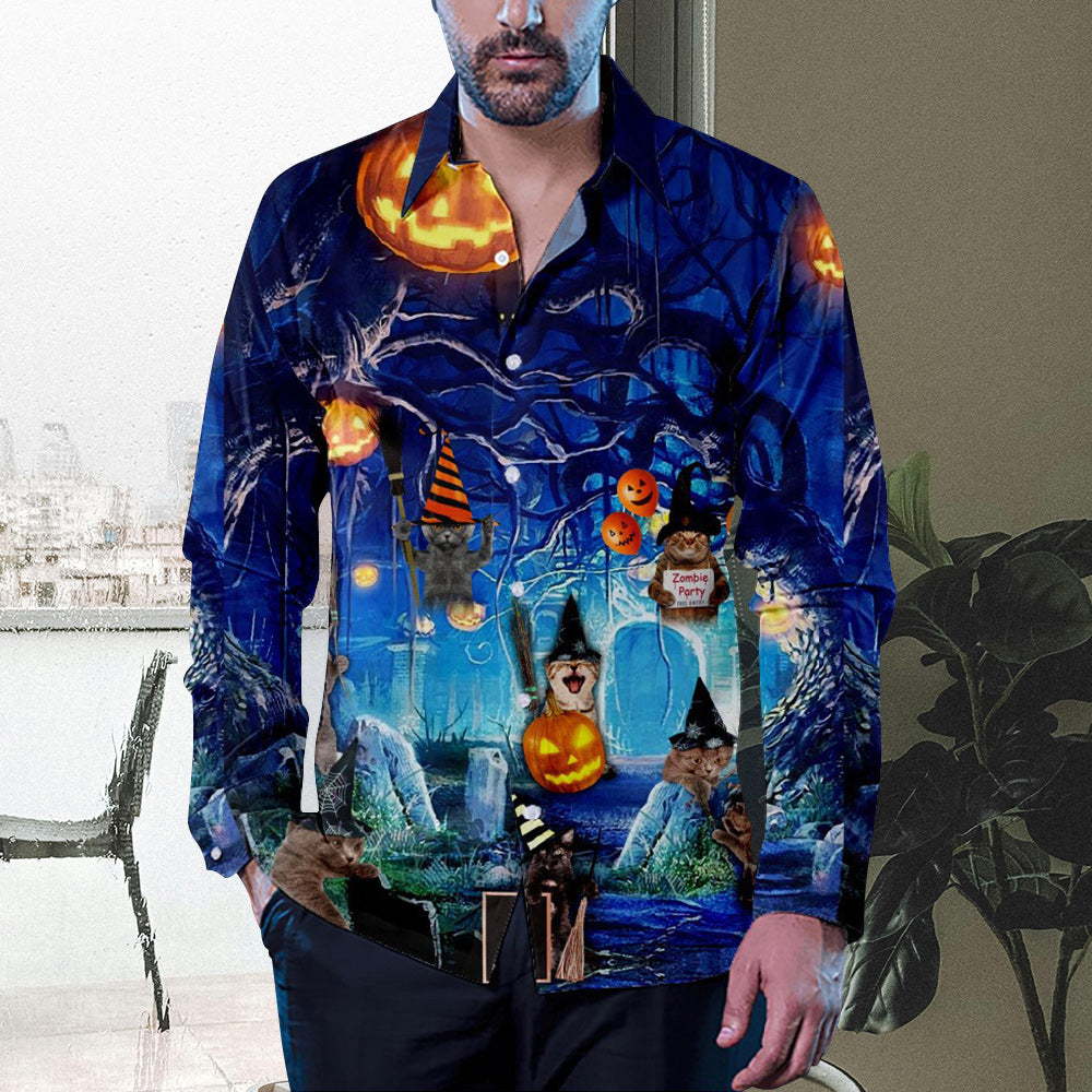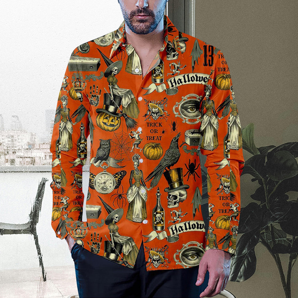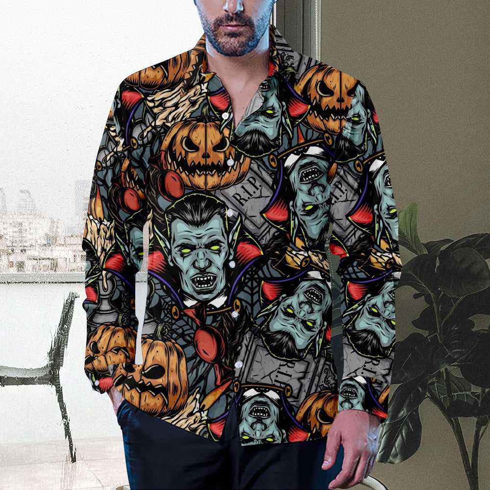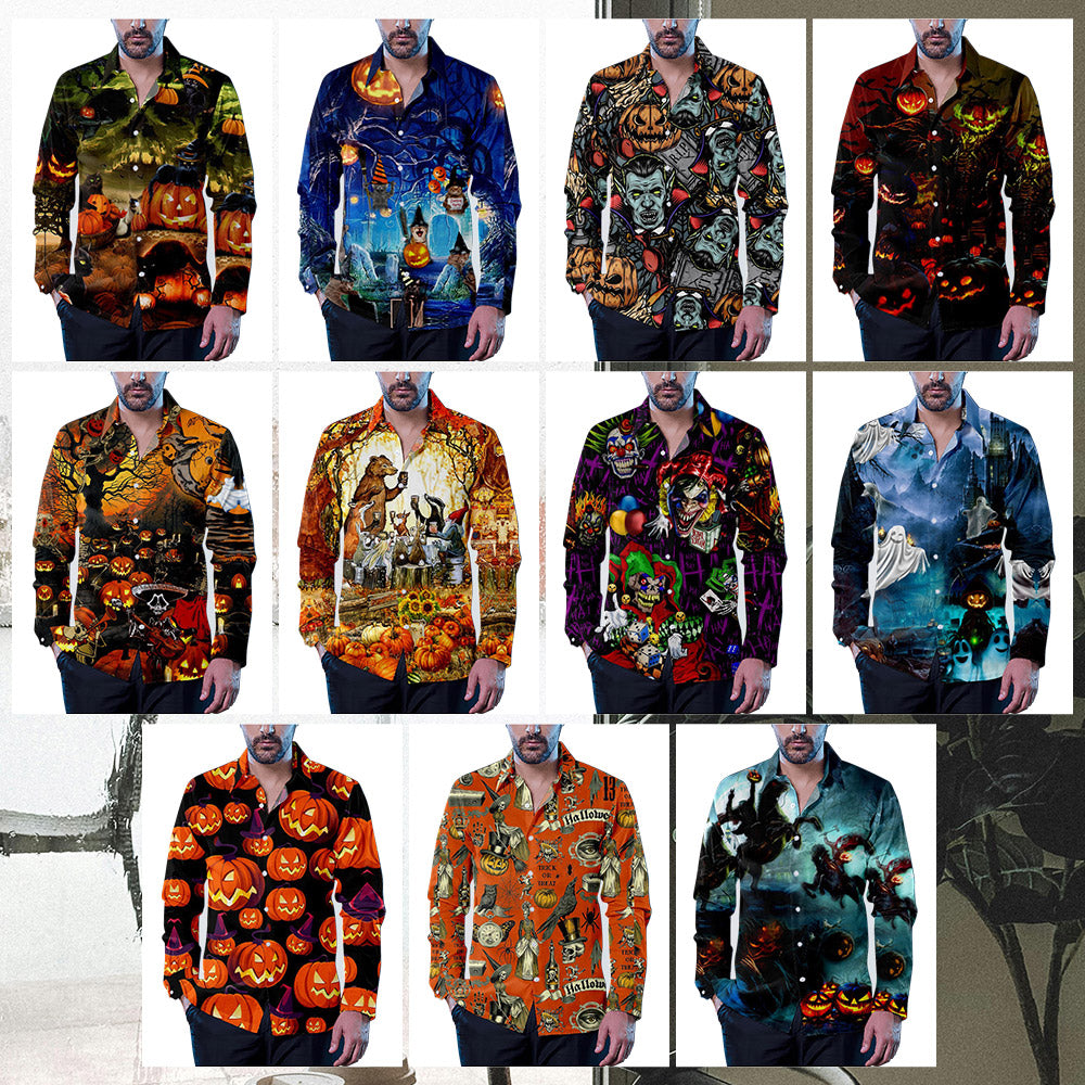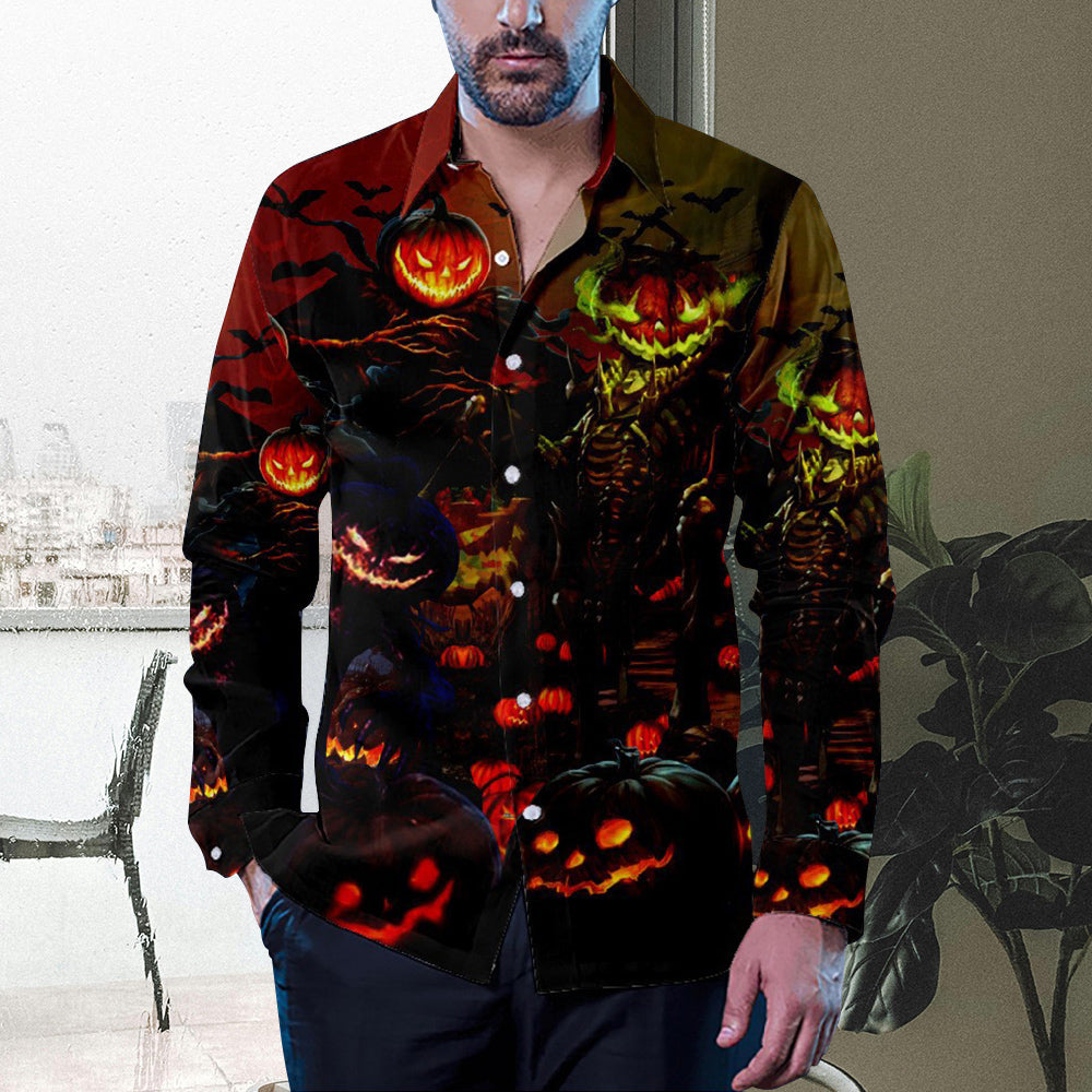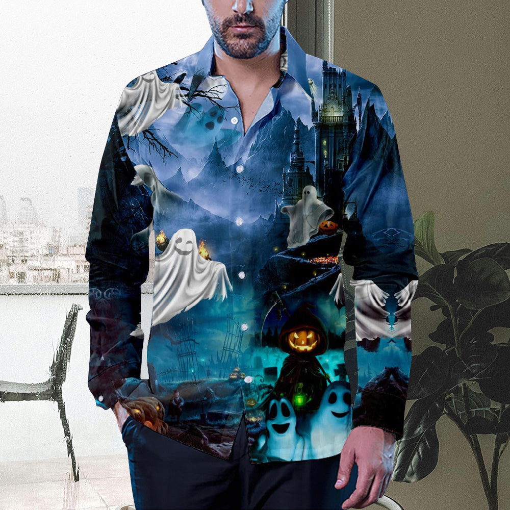 - 1 x Halloween-Serie 3D-Gedrucktes, Lässiges Revers-Langarmhemd für Herren